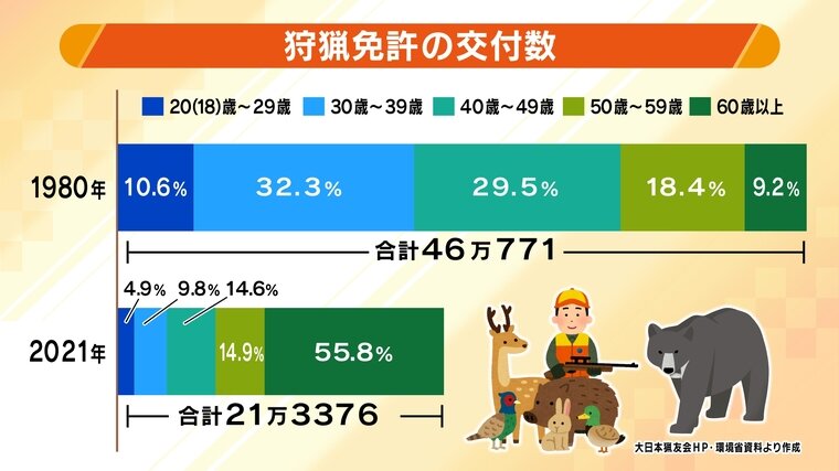 狩猟免許の交付数のデータを見ると、1980年は46万771件だったのに対し、2021年は21万3376件と半分に減っています。また、1980年は9.2%だった60歳以上の割合が、2021年は55.8%となっています(大日本猟友会HP・環境省資料より)。
