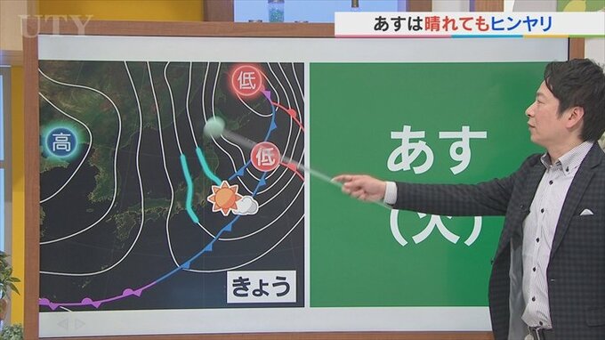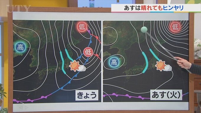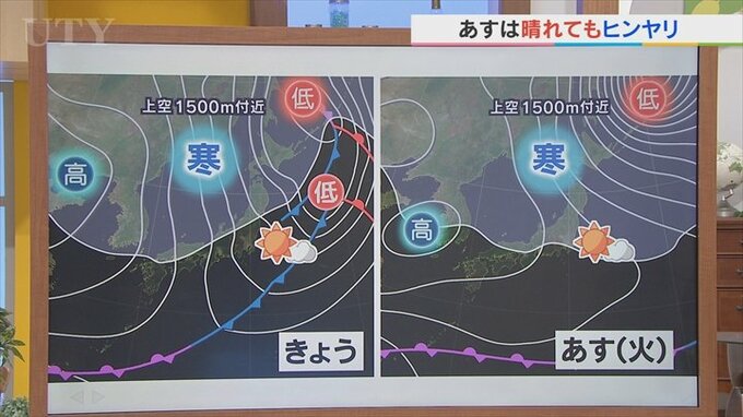 この白い線の間隔も広がってきますから、あすは風が穏やかな晴れですが上空の冷たい空気=寒気を重ねてみますと、きょうよりもあすの方が強まりますので、晴れてもあすの方がヒンヤリと感じられそうなんです。