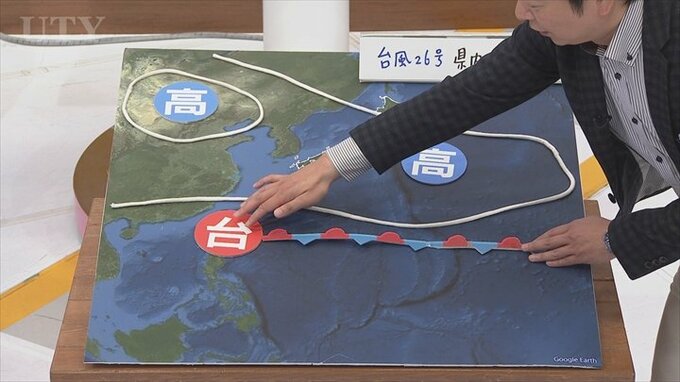 具体的に山梨への影響を見ていくと、まず台風がそもそも北上してこれない理由が、この台風の北側に高気圧があってこれが台風の進路をブロックしてるんです。