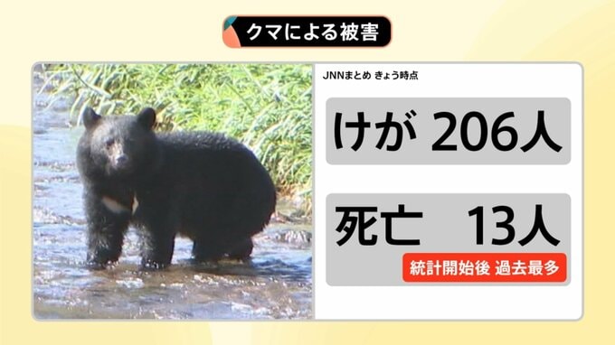 JNNのまとめによると、クマによる被害は10日時点でけが人が206人。亡くなった方は13人と、2006年からの統計開始後、過去最多となっています。