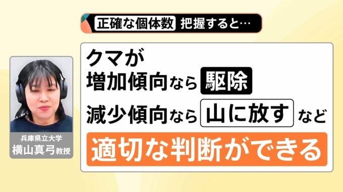 兵庫県立大学の横山真弓教授によると、正確な個体数を把握することで「クマが増加傾向であれば駆除する」。ただ、単に駆除するのではなく、何頭ぐらい駆除するかを計算できるので、「減少傾向なら山に放すという適切な判断ができる」ということです。