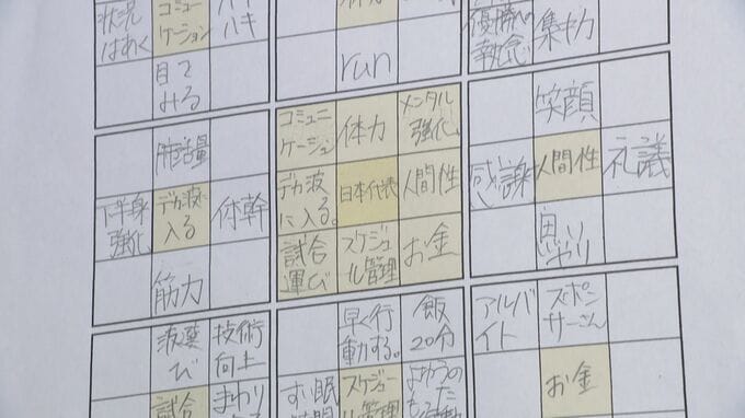 部屋には、メジャーリーガー大谷翔平選手が目標達成のために作っていたことで知られるマンダラチャートが貼ってありました。その中心には「日本代表」の文字。