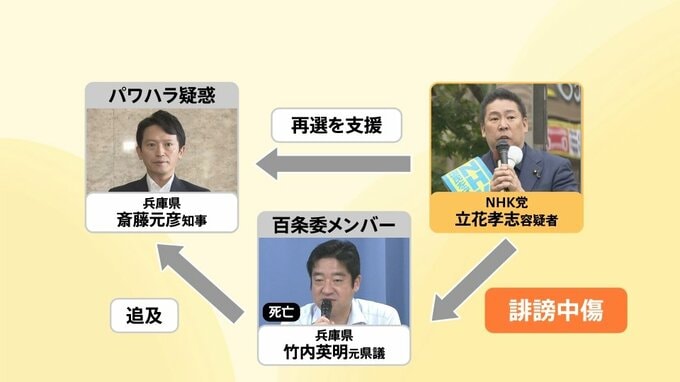 その後、斎藤知事は一度失職し、兵庫県知事で立候補すると、NHK党の立花容疑者も立候補し再選を支援しました。一方で立花容疑者は、街頭演説などで竹内氏を名指しで誹謗中傷をしていました。