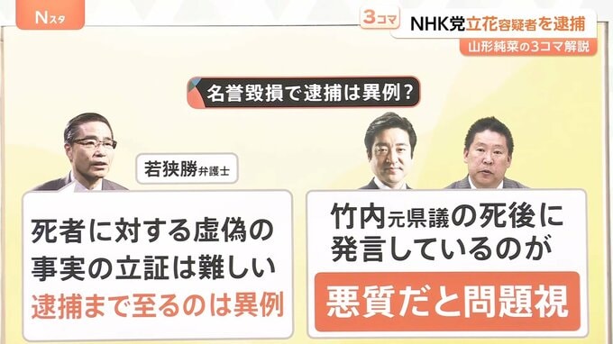 若狭勝弁護士は、「死者に対する虚偽の事実の立証は難しく、逮捕まで至るのは異例」としていて、竹内元県議の死後に発言しているのが悪質だと問題視されたのではないか、としています。