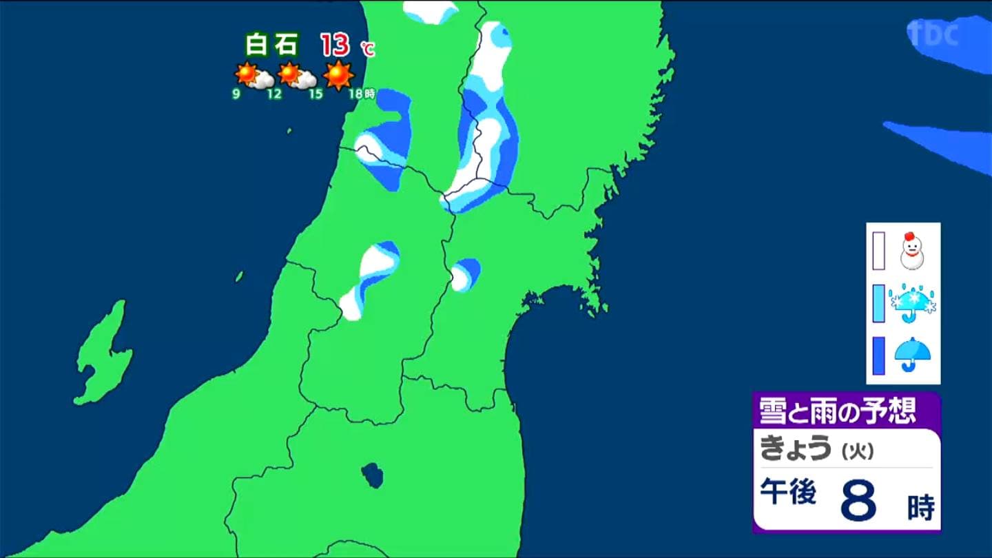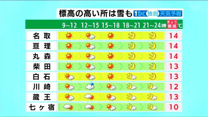 基本的には晴れの天気となりますが、西部の山沿いを中心に所々でにわか雨の可能性があります。標高のかなり高い山沿いでは、雪が混じるおそれもあります。平地では雨でも、山の上では雪になる可能性があるため、山間部へお出かけの際は注意が必要です。