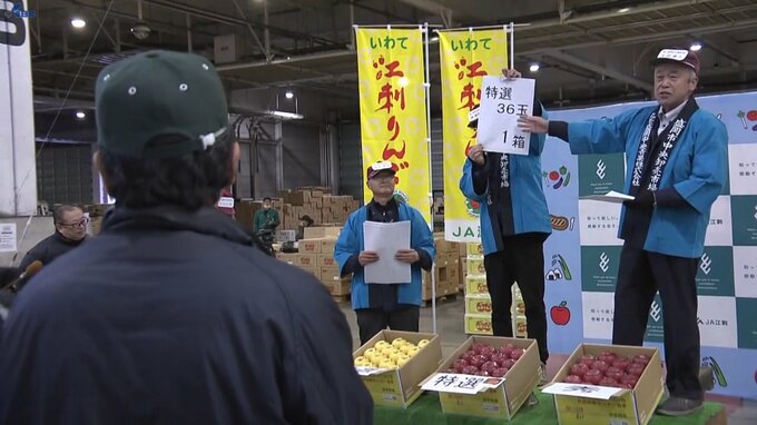 高級リンゴとして知られる江刺りんご「サンふじ」の初競りが盛岡市で行われ、最高ランクの「特選」は1箱100万円で競り落とされました。