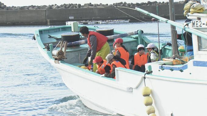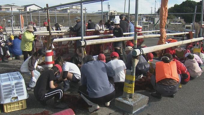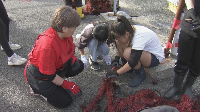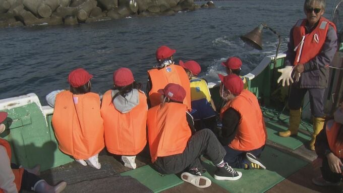児童らは沖合に出て、長さ600メートルの刺し網を力いっぱい引き上げ、港に戻ると網に絡まった伊勢エビを角や足などを折らないよう丁寧に外していきました。このほかにイシガキダイなどもとれ、児童らは地元の海の豊かさを体感していました。