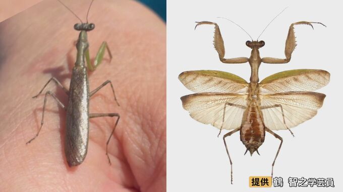 「これがちょっと私もびっくりだったんですけど、本来は羽根が茶色いイメージ。標本とかにしても茶色い羽のイメージのカマキリなんです」