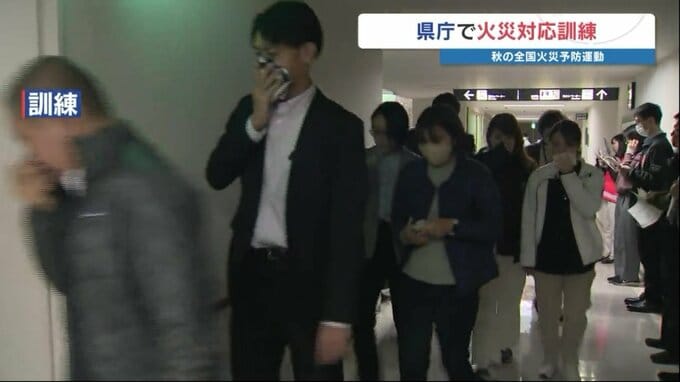 県庁では「地震発生後、庁舎内で火災が起きた」という想定の避難訓練が行われ、職員や県庁を訪れていた人など約1200人が参加しました。