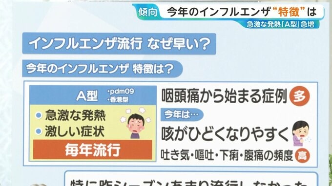 伊藤院長によると、昨シーズンにあまり流行しなかった「A香港型」の割合が多く、集団免疫が落ちているのでしばらく感染者の増加が続くのではないかということです。
