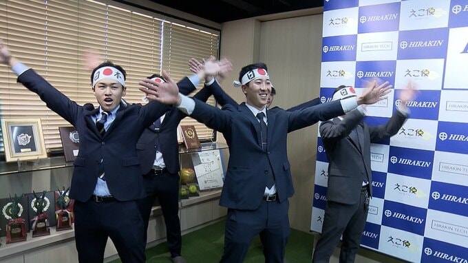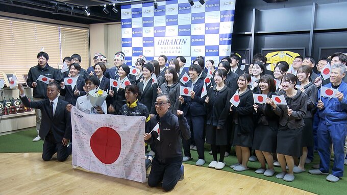 壮行会では、平林金属の社員約50人が、佐藤選手にエールを送りました。