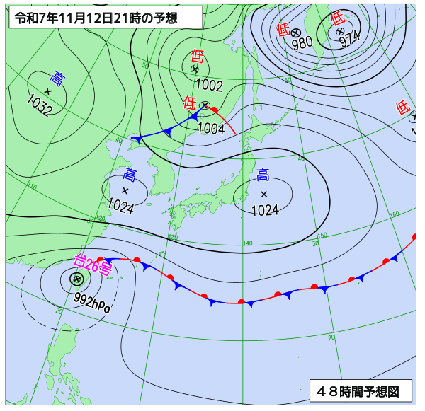 【大雨・台風情報】台風26号が沖縄へ接近中 停滞する前線も影響して沖縄・奄美で14日にかけて大雨のところあるか 『警報級の⼤⾬』『⼤しけ』の恐れも【雨風シミュレーション・気象庁の最新の気象情報】 青森テレビ 2025年11月11日(火) 15:05 国内 【天気図(最新・24時間・48時間予想図あり)】 気象庁HPより(11月11日午後2時50分現在) 気象庁HPより 気象庁HPより 気象庁HPより
