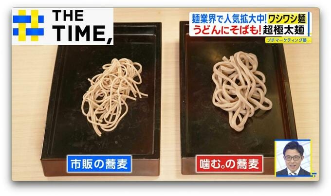 5月にオープンした『立ち食いそば 噛む。』(東京・千代田区)のウリは、噛み応えのある中太麺の蕎麦。一般的な蕎麦の倍以上の太さです。