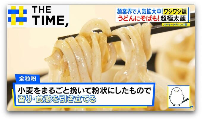 麺の太さは一般的なうどんの約2倍。小麦をまるごと挽いて粉状にした「全粒粉」を練り込むことで、弾力と小麦の風味が格段にアップするといいます。
