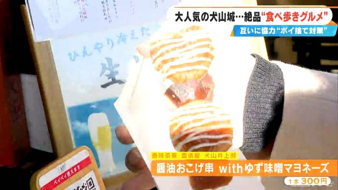 大人気の「醤油おこげ串 withゆず味噌マヨネーズ」1本300円。