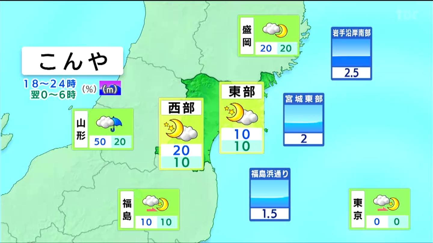 11日夜の天気です。概ね晴れますが、北部の山沿いではにわか雨があり、標高の高い地域では雪が混じるでしょう。