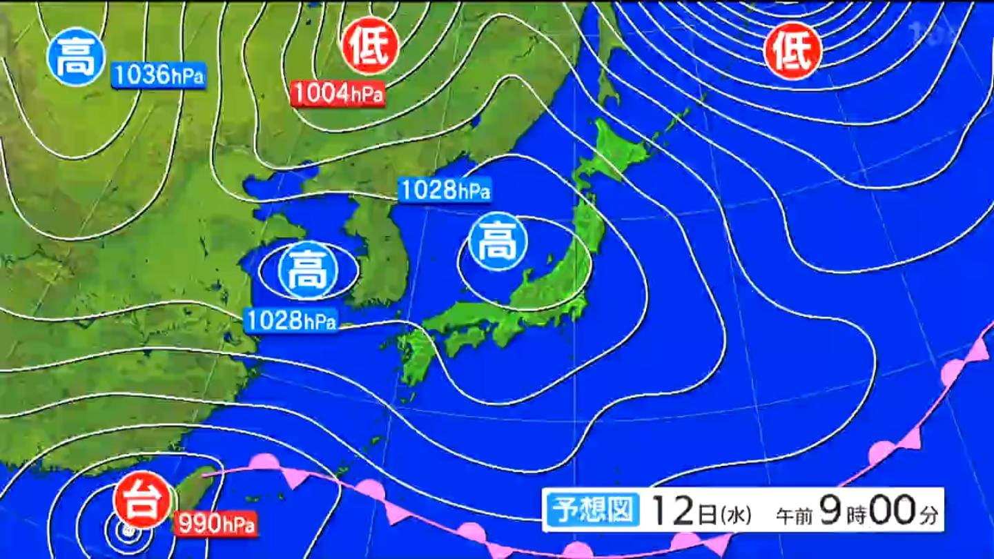 12日午前9時の予想天気図です。移動性の高気圧が本州付近を広く覆うでしょう。全国的に晴れる所が多くなりそうです。