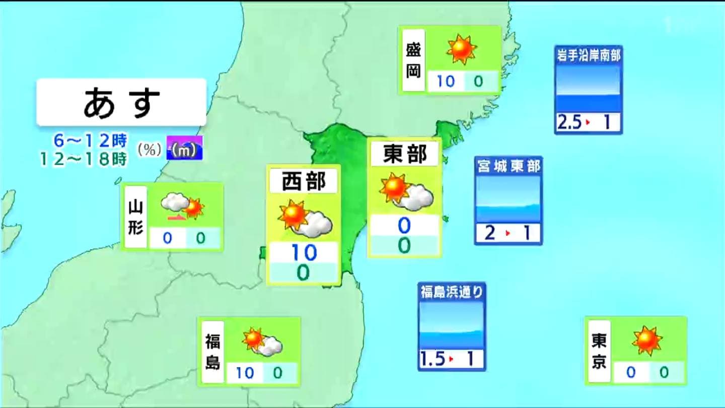 12日の天気です。概ね晴れて、風もおさまり穏やかな一日となるでしょう。空気の乾いた状態は続くため火の取り扱いに注意してください。