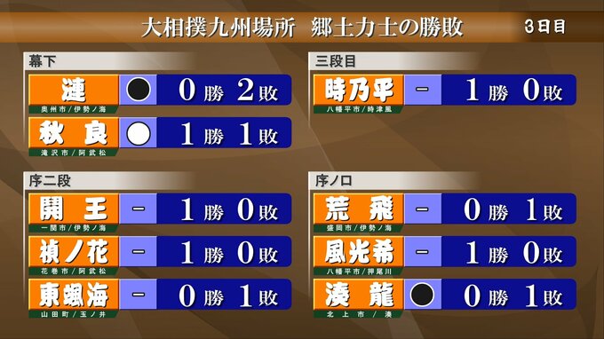 大相撲名古屋場所3日目郷土力士の取り組み結果です。