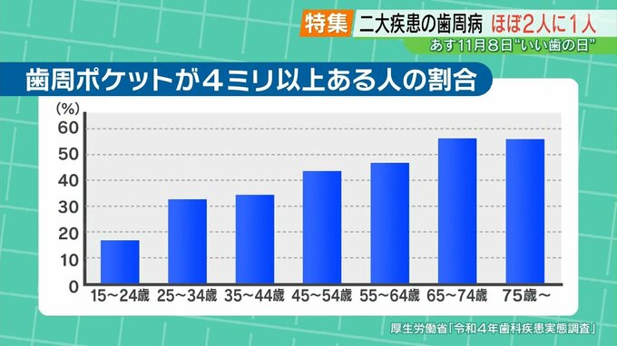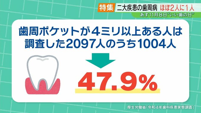 厚生労働省が行った歯科疾患実態調査の結果、初期の歯周病と判断される歯周ポケットが4ミリ以上の人は、全体の47.9%、ほぼ2人に1人の割合でした。