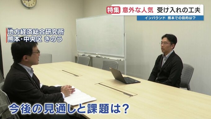 地方経済総合研究所 山田博史主任研究員「外国人観光客の約65%が熊本市と阿蘇地域に集中していて、地域間格差が明確。是正に向けては周遊ルートの設定と多言語発信の強化を両輪で進める必要がある。観光ルールやマナーを多言語化して、外国人が分かりやすい形で理解できるようにすることも大事」