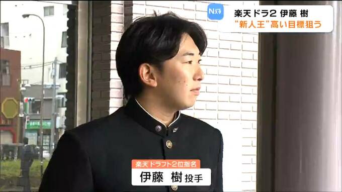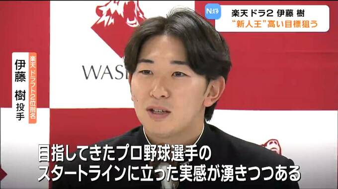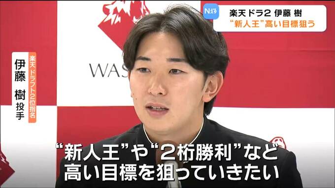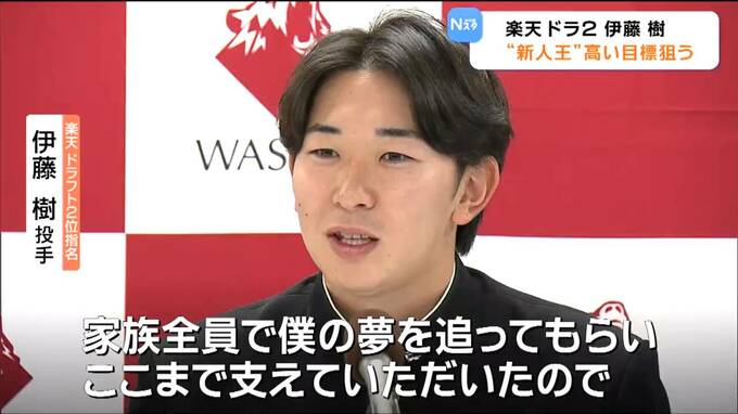 楽天イーグルス・ドラフト情報です。ドラフト2位指名で来シーズン即戦力として期待される早稲田大学の伊藤樹(いとう・たつき)投手。指名挨拶を受けプロ入りへの抱負を語りました。