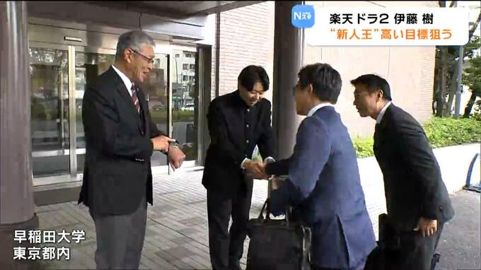 楽天からドラフト2位指名を受けた早稲田大学・伊藤樹投手のもとに愛敬スカウト部長らが指名挨拶に訪れました。