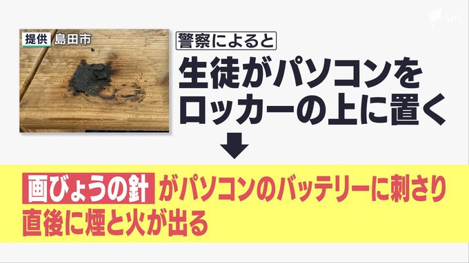 警察によりますと、生徒がパソコンをロッカーの上に置いたところ、画びょうの針がパソコンのバッテリーに刺さり、その直後に煙と火が出たということです。
