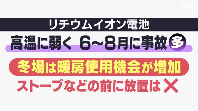 リチウムイオン電池は、「高温に弱い」という特性があり、年間の事故は6月から8月に多い傾向にあります。ただ冬場は暖房の使用機会が増えるため、「リチウムイオン電池を使った製品はストーブなどの高温の暖房器具の前に放置しないでほしい」としています。