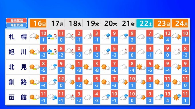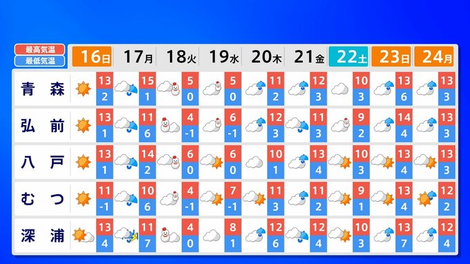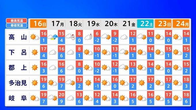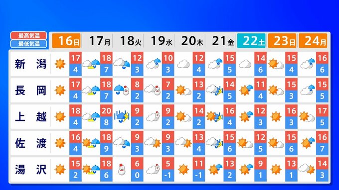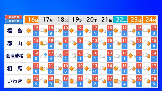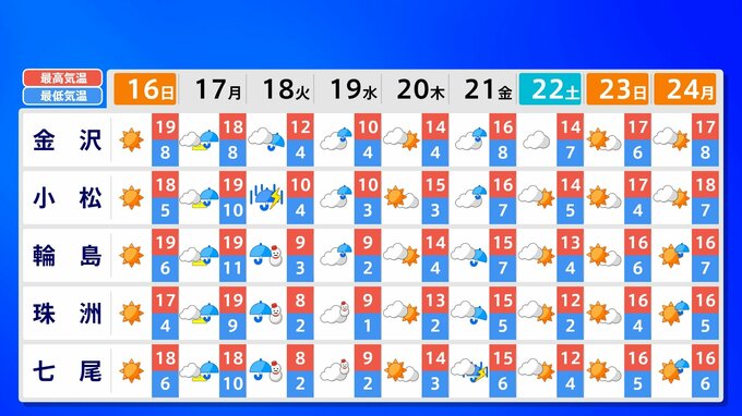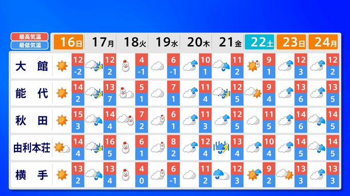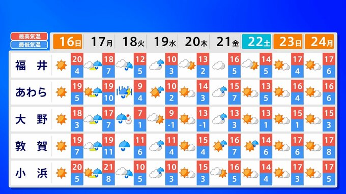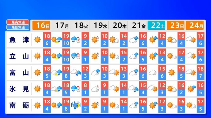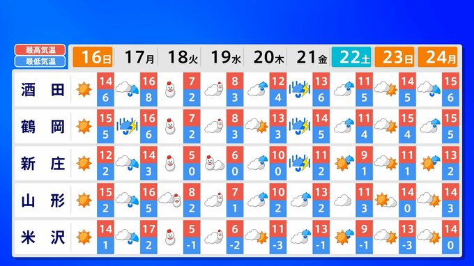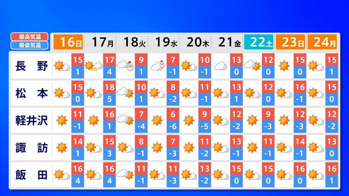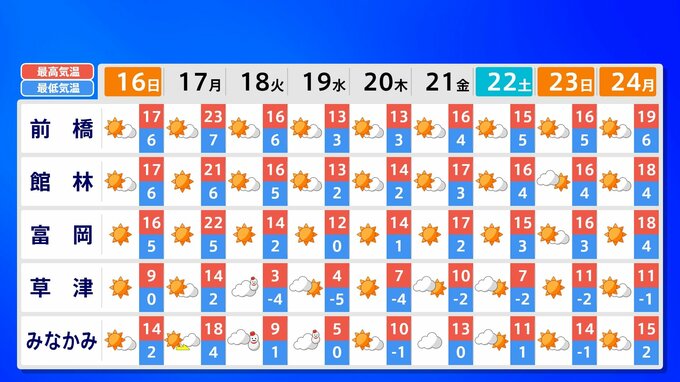 24日(月振)までの週間予報を画像で掲載しています(各県5か所ずつ)。
