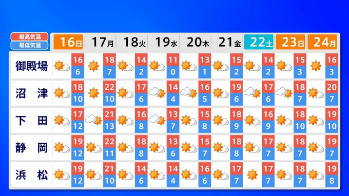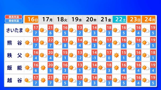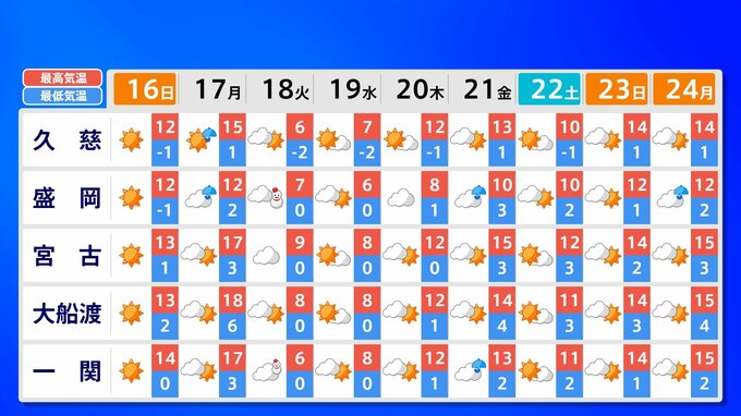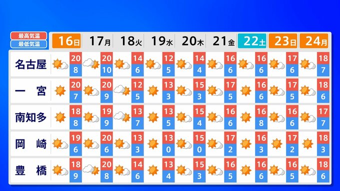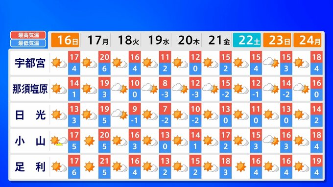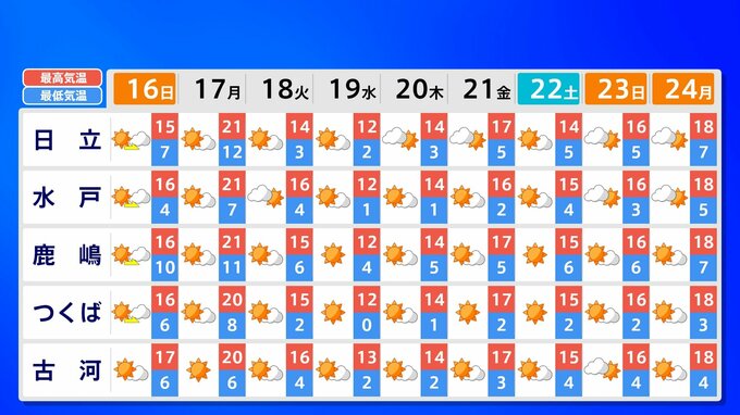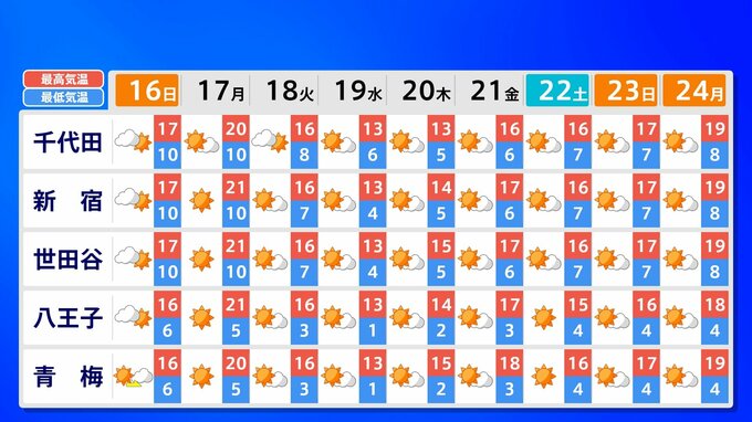 17日(月)は風が強いため、交通機関の乱れにも注意してください。18日(火)19日(水)は各地で冷え込みが強まり、19日(水)の東京の最高気温は13℃・大阪は12℃と予想されています。次の3連休まで画像で確認できます。