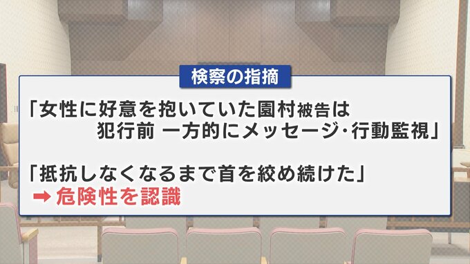 検察は「女性に好意を抱いていた園村被告は、犯行前に一方的にメッセージを送ったり、行動を監視したりしていた」「女性が抵抗しなくなるまで首を絞め続けた」など、危険性を認識していたとしています。