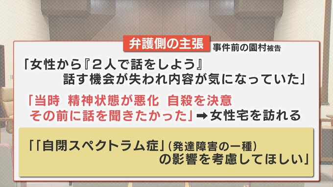 一方で弁護側は「事件前に、園村被告は女性から『2人で話をしよう』と言われたが、話をする機会が失われ、その内容が気になっていた」「当時、精神状態が悪化し自殺を決意していたが、その前に話を聞きたかった」と、女性の自宅を訪れた経緯を説明しました。