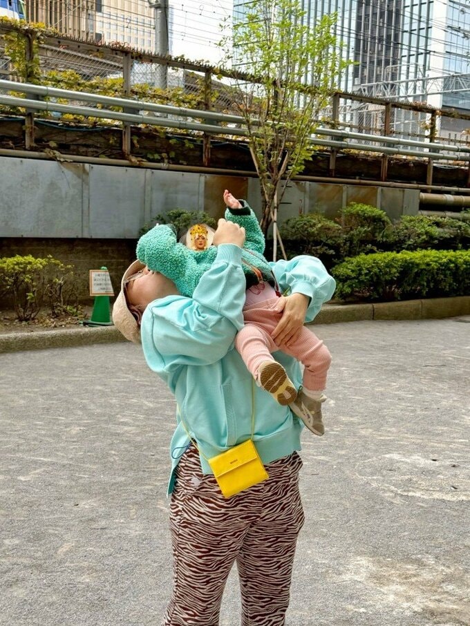バービーさんは「1歳2ヶ月 VS 41歳9ヶ月」とテキスト。写真では、嫌がるから抱っこしたのか、抱っこしたから嫌がっているのか、バービーさんに抱き上げられた子どもが体を思い切り反らせて、バービーさんの顔を押しのけたりして逃れようとしているような姿を投稿しています。