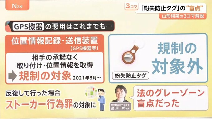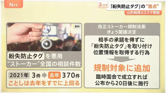 11日に閣議決定された改正ストーカー規制法案では、相手の承諾を得ずに紛失防止タグを取り付け、位置情報を取得する行為が規制対象に追加されました。今の臨時国会で成立すれば、公布から20日後に施行されるということです。