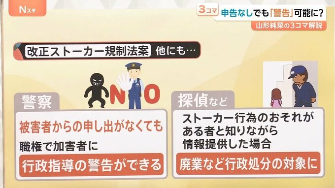 やはり被害者は報復を恐れ、なかなか申し出ができないというケースがあります。しかし今回の規制法案では、警察は被害者からの申し出がなくても、職権で加害者に行政指導の警告ができるということです。