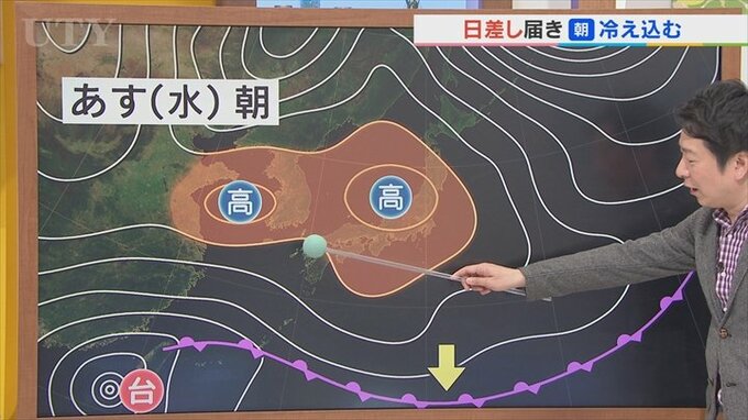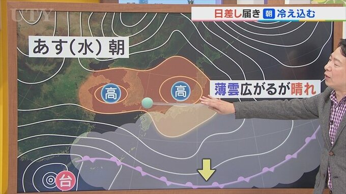 高気圧に覆われる見通しですがもしかするときょうと同じように前線の雲が北へと盛り上がってくる可能性がありますので、日差したっぷりというよりあすもきょうと同じように薄雲は広がりますが晴れの天気となりそうです。