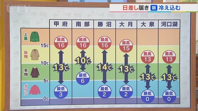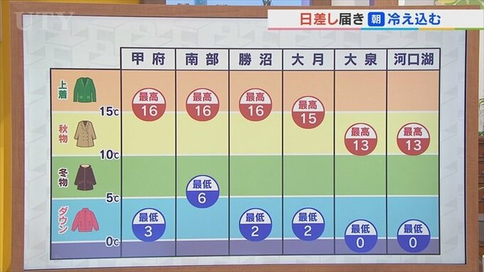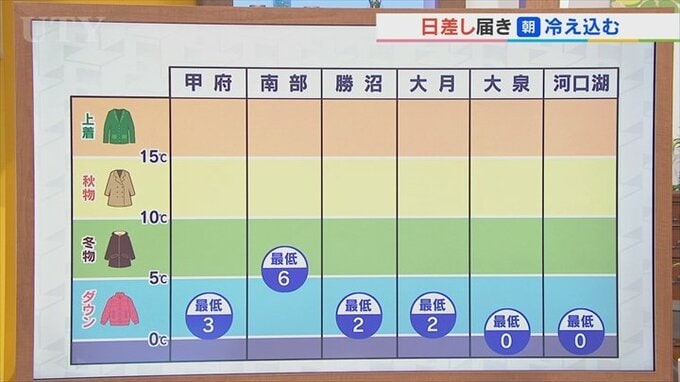 甲府の最低気温は3℃予想。これは今シーズン一番の冷え込みを予想しています。霜が降りてもおかしくないぐらいの冷え込みです。
