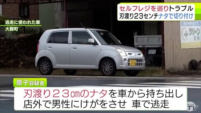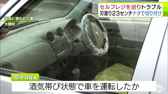 原子容疑者はその後、刃渡り23cmのナタを車から持ち出し、店の外で男性にけがをさせると、現場から車で逃走。酒気を帯びた状態で運転していたとみられます。
