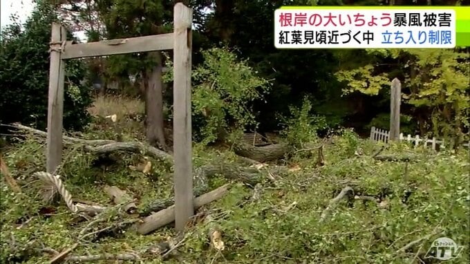 樹齢1100年超の『根岸の大いちょう』暴風で枝や幹が折れる 幹や枝は鳥居にも倒れ… 神社へつながる通路はふさがれる 管理する人も「初めてのこと」 町は安全確保のため立ち入りを制限 青森県おいらせ町