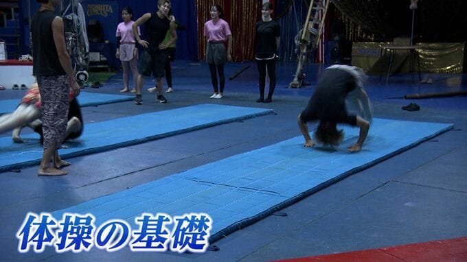 前転は体操の基礎。ここでは、主にデビュー前の若手団員が参加し、基礎の練習をしているのです。