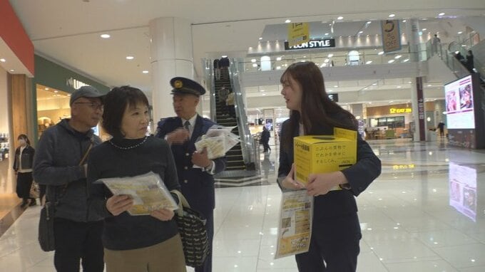 イオンモール甲府昭和で行われた啓発活動には南甲府警察署の警察官などおよそ20人が参加しました。