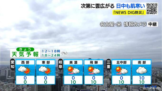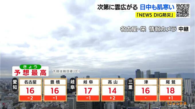 東海地方は、きょうは雲が多く、日中も肌寒さの続く所が多いでしょう。