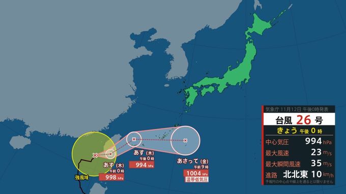 大型の台風26号は、きょう(12日)正午現在、バシー海峡を1時間で10キロの速さで北北東へ進んでいます。