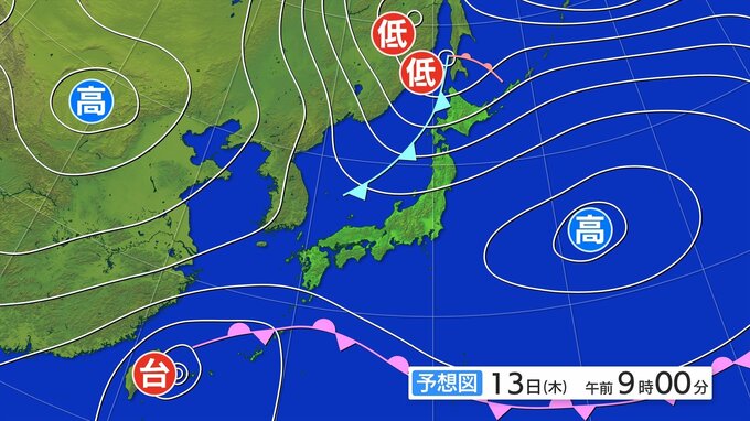このあと進路を東よりに変え、あさって14日午前9時には南西諸島付近で前線と一体化し、南大東島の北で温帯低気圧に変わる見通しです。
