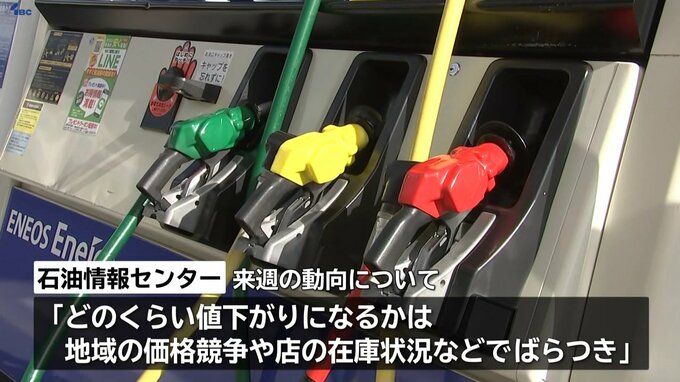 石油情報センターは来週の動向について、「ガソリンの暫定税率廃止に向けて13日から政府の補助金が5円増額されることから値下がり予想」としています。
