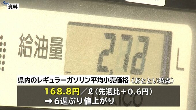 石油情報センターによりますと、10日時点の県内のレギュラーガソリンの平均小売価格は先週に比べ0.6円高い、1リットルあたり168.8円でした。