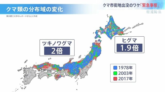 東京農工大学のレポートによると、クマの分布域は1978年に確認されていたエリアから、2003年にはやや拡大。2017年にはさらに広がった。