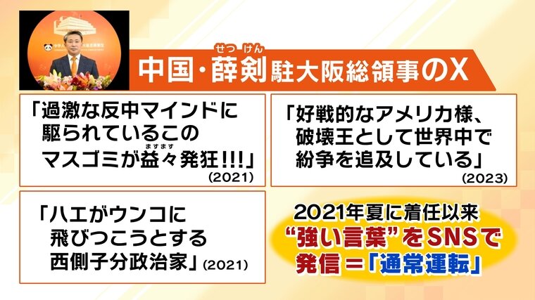 外交官とは思えない中国・薛剣駐大阪総領事のXへの投稿。しかし、ノンフィクション作家・安田峰俊氏によると、これは「通常運転」だということです。2021年夏、薛剣氏は現職に着任して以来、強い言葉”をSNSで発信しています。その矛先は、日本だけではありません。