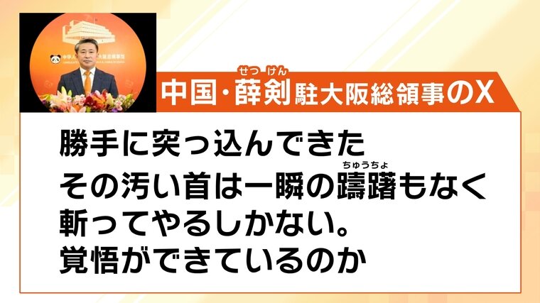 「その汚い首は一瞬の躊躇もなく斬ってやるしかない」。高市総理に対する中国・薛剣駐大阪総領事の過激なSNS投稿が物議を醸しています。